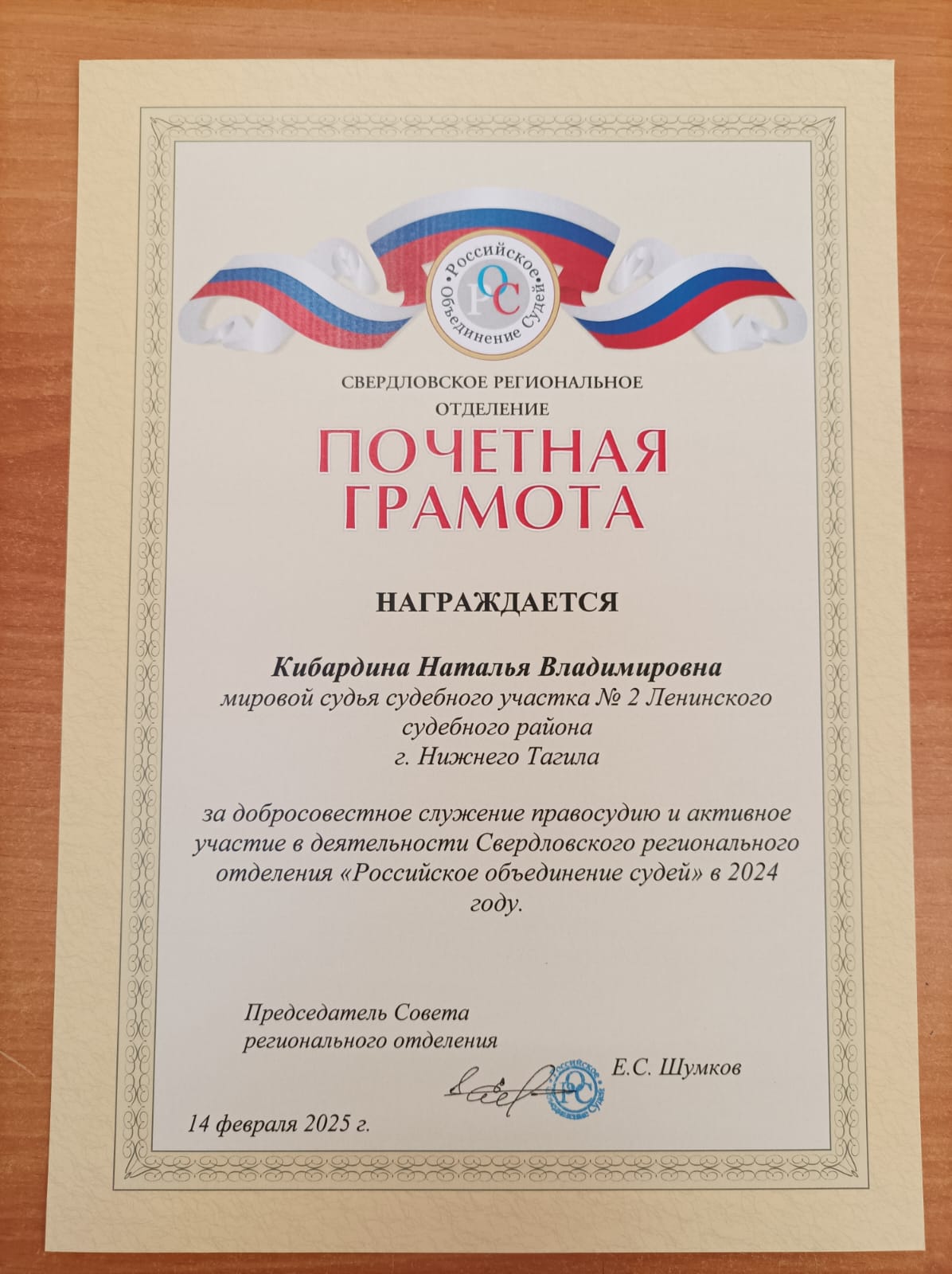 14 февраля 2025 года во Дворце Правосудия мировому судье судебного участка № 2 Ленинского судебного района г. Нижнего Тагил Кибардиной Наталье Владимировне вручена почетная грамота за добросовестное служение правосудию и активное участие в деятельности Свердловского регионального отделения «Российское объединение судей» в 2024 году. Мировому судье судебного участка № 2