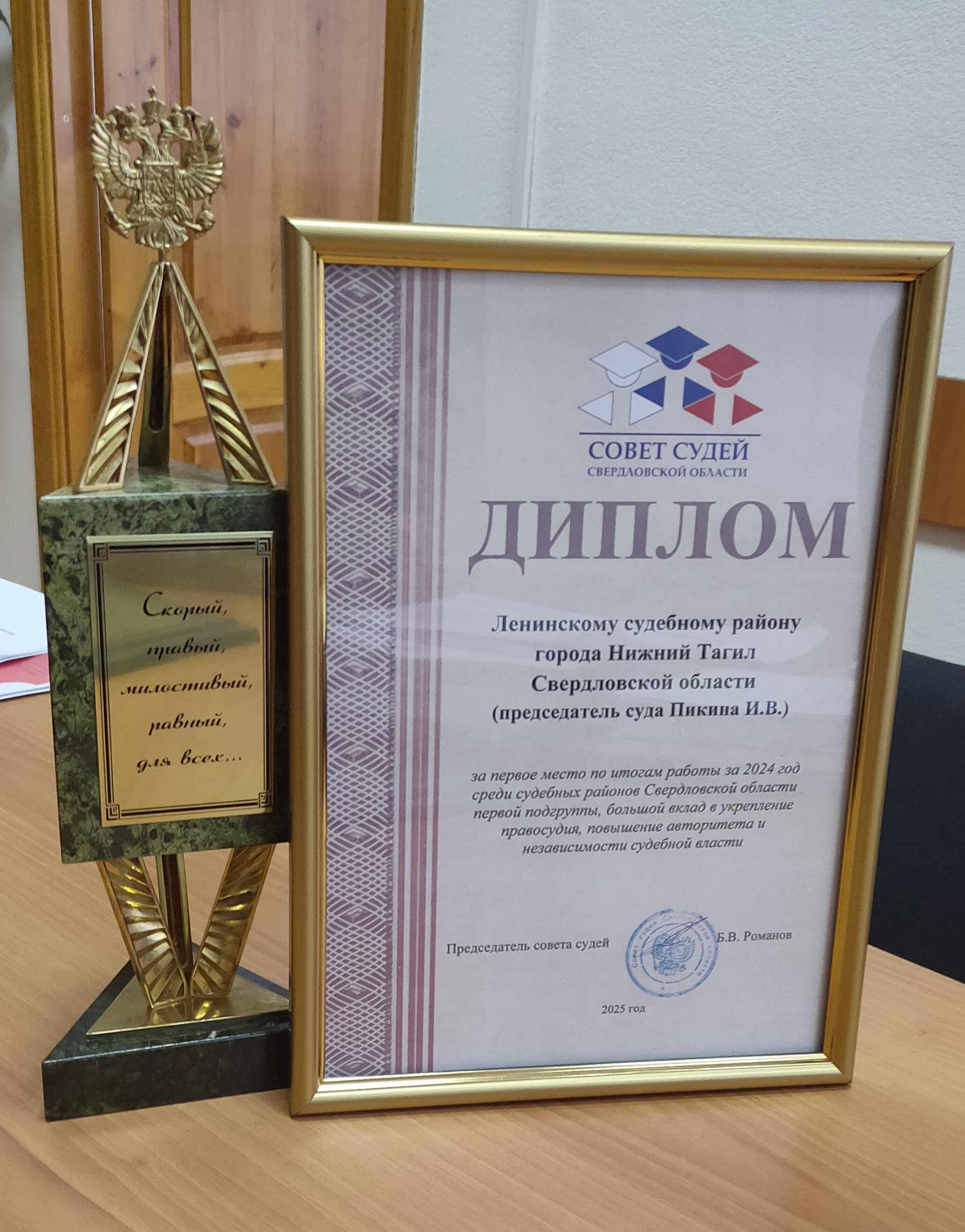 На совещании по итогам работы районных, городских судов и мировых судей Свердловской области за 2024 год Ленинский районный суд города Нижний Тагил был награжден дипломом Совета судей Свердловской области за 1 место среди судов первой подгруппы с вручением переходящего приза «Зерцало правосудия», председатель суда Пикина Ирина Валерьевна. Переходящий приз «Зерцало правосудия» учрежден Советом судей Свердловской области в 2010 году в целях повышения качества осуществления правосудия, обеспечения защиты прав и законных интересов граждан и организаций, повышения авторитета судебной власти и статуса судьи. Победитель выбирается по 10 критериям, главными из которых являются: качество отправления правосудия и соблюдение сроков рассмотрения дел. Приз создан по образцу и подобию зерцала, утвержденного Петром Первым. Это трехгранная призма с написанными на ее гранях указами Петра Великого. В те времена во всех государственных учреждениях имелось своеобразное «зеркало души» чиновника. Предполагалось, что прежде чем вершить дела, слуга закона должен заглянуть в зеркало, чтобы привести свои помыслы в соответствие с совестью и действовать на благо государства. ![]() Кроме того, Совет судей Свердловской области принял решение о награждении Ленинского судебного района города Нижний Тагил Свердловской области специальным диплом за высокие достижения при осуществлении правосудия и повышение авторитета судебной власти, отмеченные вручением переходящего приза «Зерцало правосудия» в 2021, 2022, 2023, 2024 годах, председатель суда Пикина Ирина Валерьевна. |